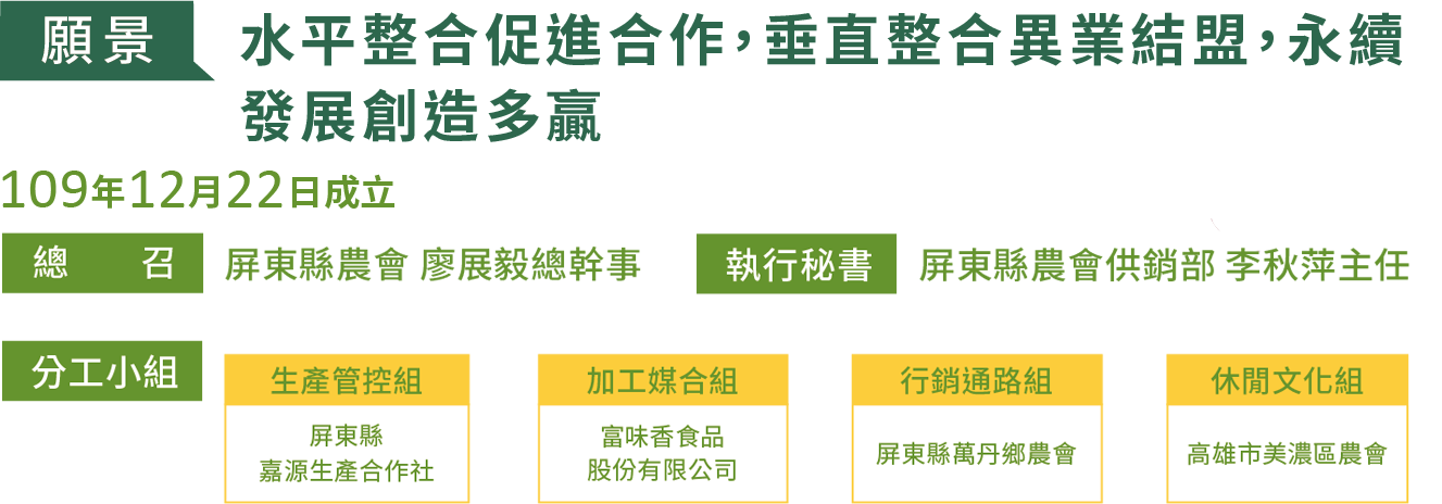 為有效推動業務發展,聯盟分為「生產控管組」、「加工媒合組」、「行銷通路組」、「休閒文化組」等四個小組,針對生產、加工、內銷、休閒等面向進行有效整合,各小組成員藉由實地參與,了解國產紅豆產業的現況與未來發展願景,將有助於後續相關業務的推廣。